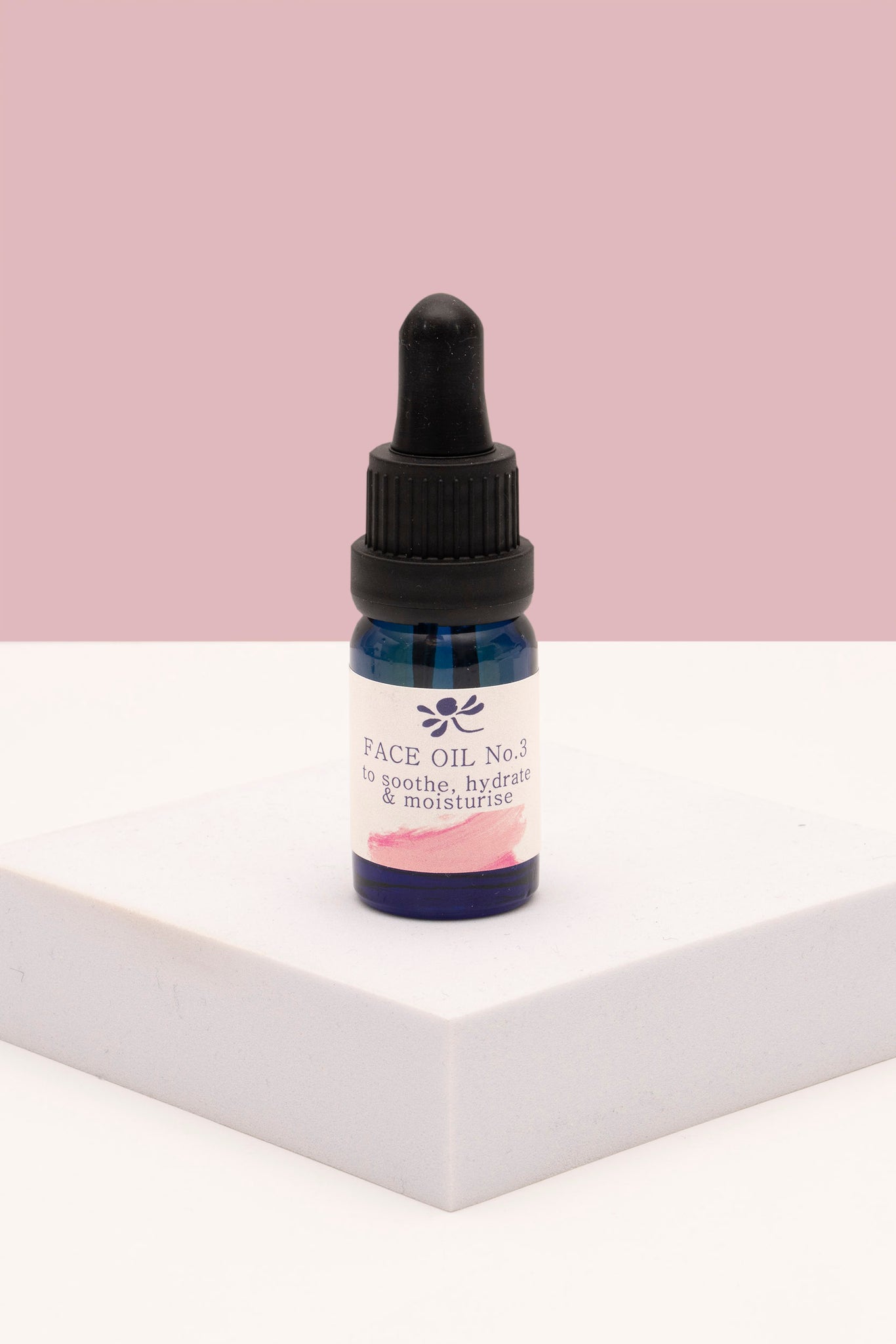 Bottle of Face Oil No3 from Soap Matters on a white surface with a pink background