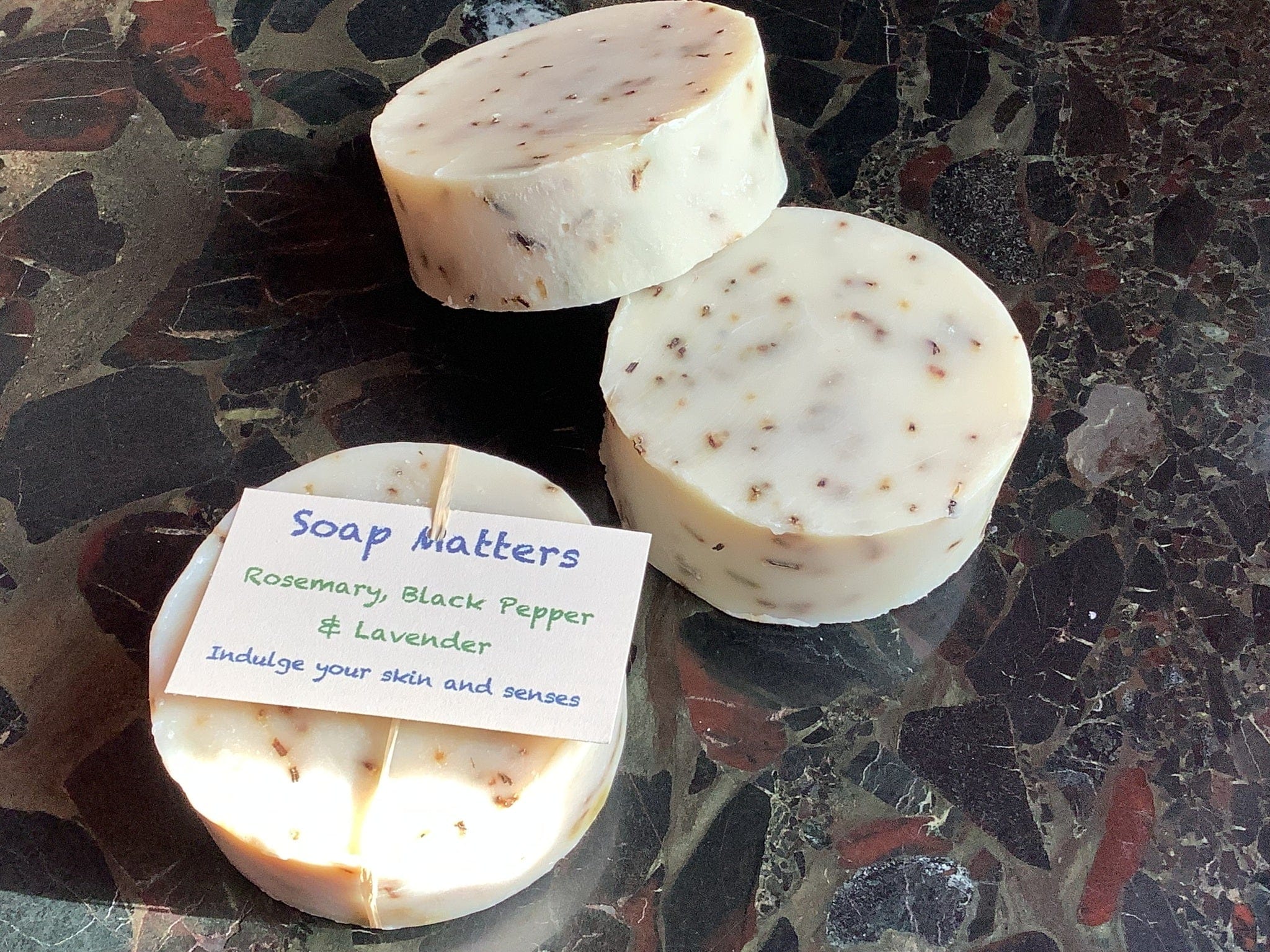 Great creamy lather and long lasting bar. Flecked with Rosemary leaves for gentle exfoliation. Use in the shower (for hair washing too) or by the sink or bath. Great for just yours hands or everywhere including your face, as it is natural, deep cleaning and moisturising! Also lasts a long time.