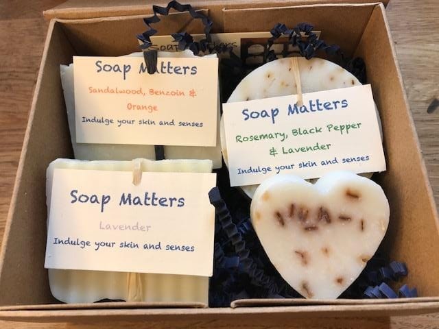 We have provided a choice of two combinations of three soaps - one with Rosemary/Black pepper/Lavender, Sandalwood/Benzoin/ Orange and Lavender and the other with Juniperberry/Lavender, Lemon/Frankincense and Geranium/Bergamot.